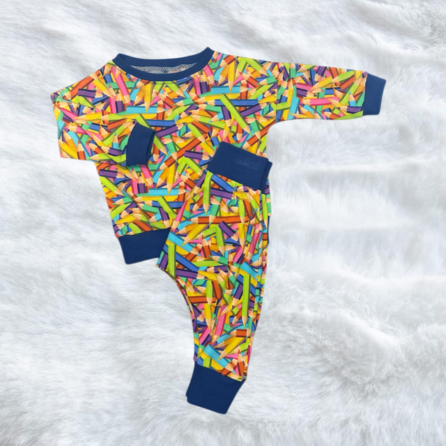 These adorable handmade jumper/trouser feature a crayon print. Thoughtfully designed for comfort and everyday wear, they’re perfect for playtime, outings, or cosy days at home.
